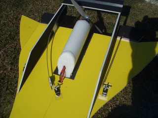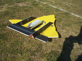 重心位置がこの構造では白い筒の前(コードの所)なので、テールヘビーだったので、10秒目標でしたが、約1秒で、テール側が下がって、あっという間に墜落。