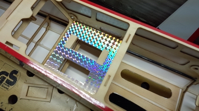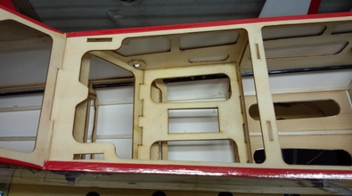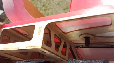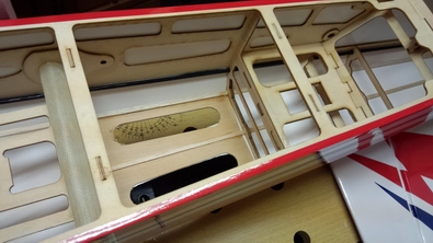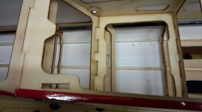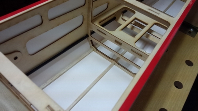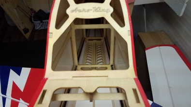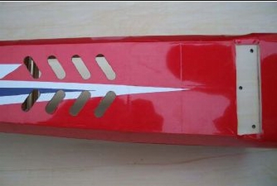 胴体内部は、両側面にカーボンで補強してありました。 しかし、下の写真のように空気口の板が無いため、2mmのシナべニアで |