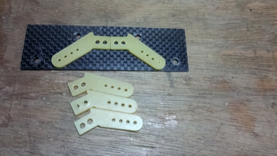 サーボホーンはエレベーターが片引き仕様で、5個ですが、 エレベーターを両引きに改造するので、不足分は、その辺に有った カーボン板を加工して作ります。 |