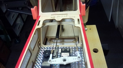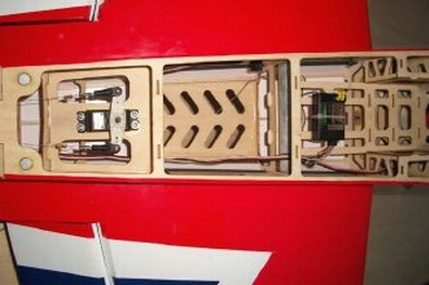 とりあえずエルロン・エレベーター・ラダーのリンケージが完了しましたので 後は、ホビーネット指定のカンザシ位置に重心を見ながら、受信機やバッテリーの位置決めです。 |