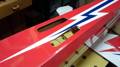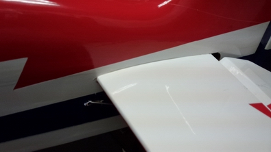 ネットのお友達に尋ねたら、背面でチョットダウンを打つ位置と言う事で、とりあえず、受信機を移動して、カンザシギリギリまで、バッテリーを下げましたが、飛ばしてみたら、まだ前が重いようです。 飛ばした感じでは、写真のあたりが重心の様なので、受信機バッテリーを後ろに大幅に移動した方が良いみたいです。 |
