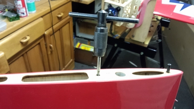 胴体は肉抜き構造の為、穴位置は内側の同枠前から出るように、慎重に 下に開けた穴は、ラダーワイヤーを通す穴で、下穴があけてあるので |