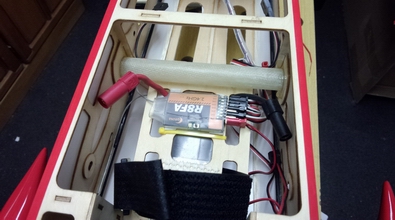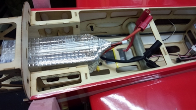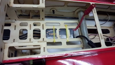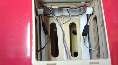受信機はこの位置で固定しようと思いましたが重心の関係で、動力バッテリーの前に移動しました。 |