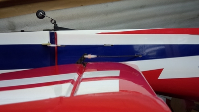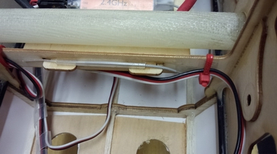 最初は受信機のアンテナは胴体側面と、この位置に配置しましたが、受信機を前に移動しましたので、前に移動してます。 ノイズレスチューブを瞬間で接着した後、アンテナを差しこんで赤の結線バンドあたりをセロテープで止めれば、確実に配置できます。 |