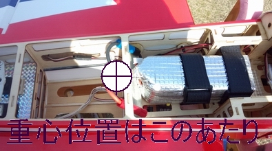 | 重心位置は、ホビーネットに確認したら、カンザシが重心位置と言う事で 動力バッテリーと受信機用バッテリーの位置で調整してしました。 |