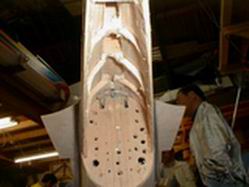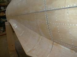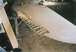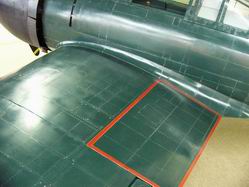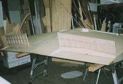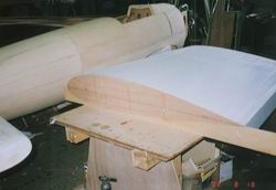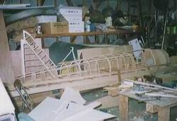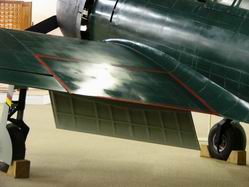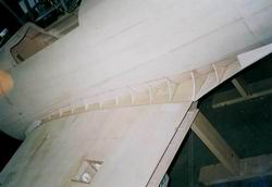 | 主翼は、さらに2mmのシナベニヤでプランク ねじり下げ加工がしてあり、エルロンの形状は、実機 さながらでサーボへの付加を300gのおもりでバランスを とっている。 |