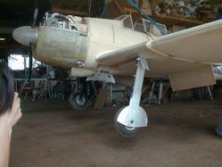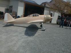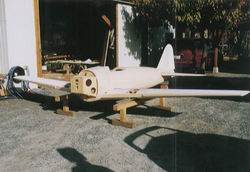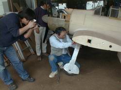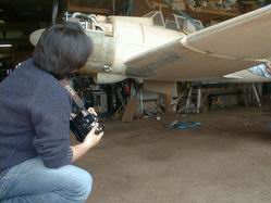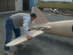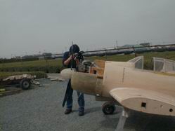 | ほぼ生地完成と成り、この日は、air worldの鈴木氏が取材。 引き込み脚はエアー式でエアーを充填してるところです。 |