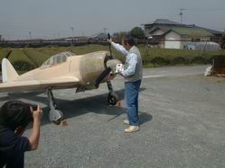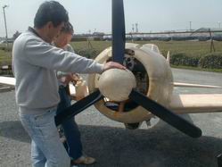 | 折角なので、エンジンをかけることになり、ガソリンを 注入しているところです。 手前は、九州の大和フライングクラブ会長、野田氏です。 |