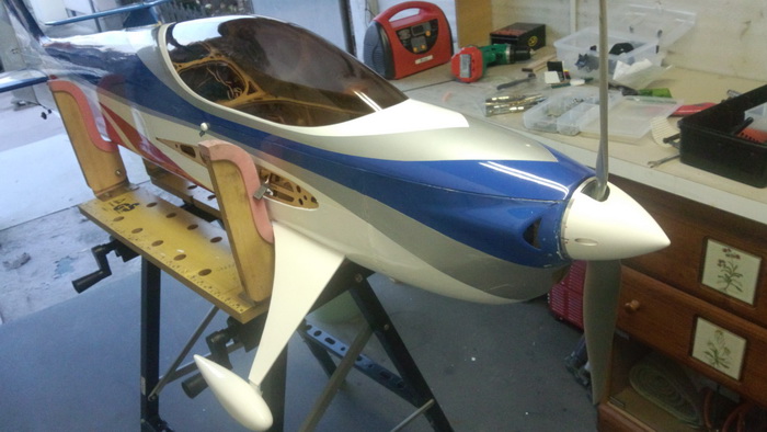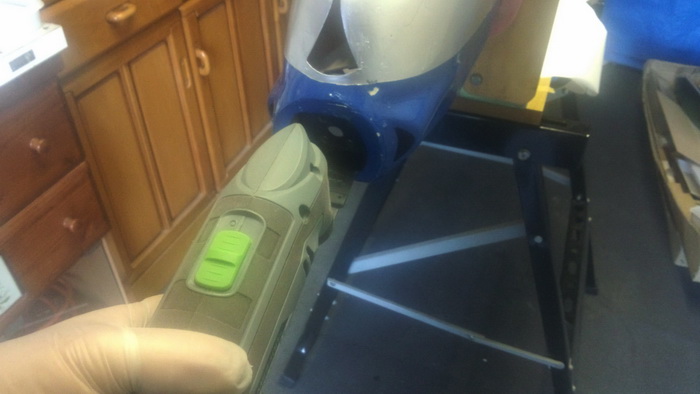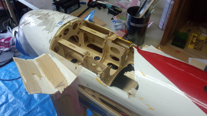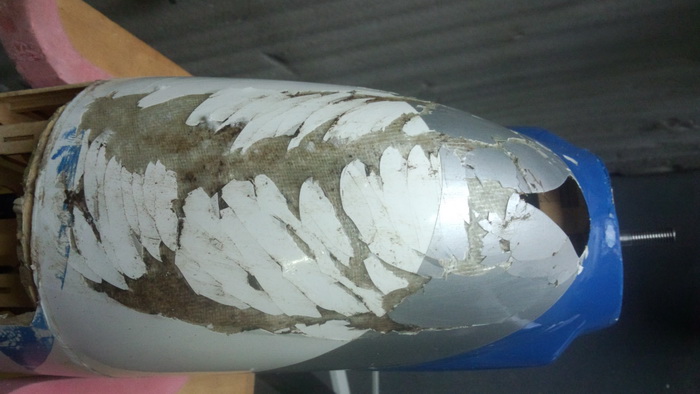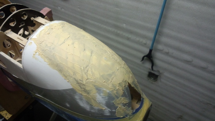 手始めにフニャフニャになったカウルを低粘度の瞬間で有る程度固めてパテ埋めし、ペーパーで綺麗に削り込みました。 |