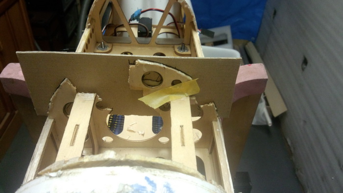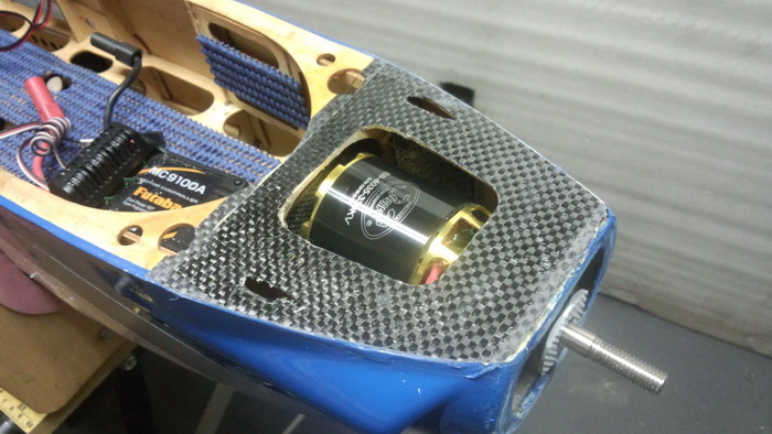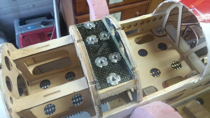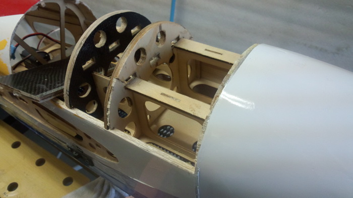 モーターを8mm後退させるために4mmベニヤ2枚にカーボン貼ってモーターマウントを内側から接着します。 |