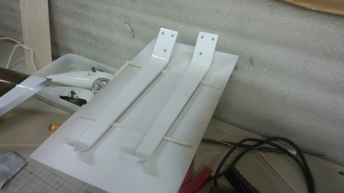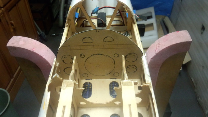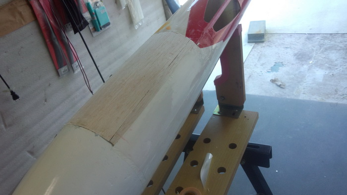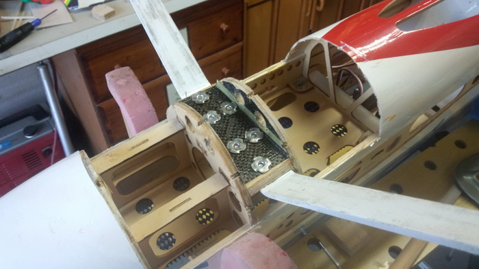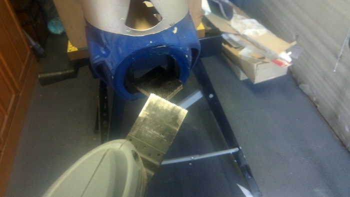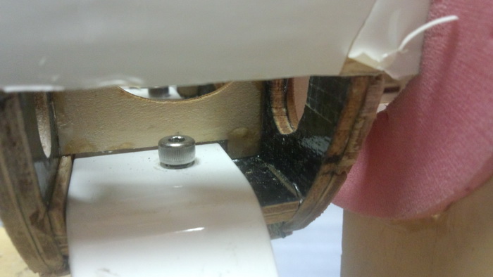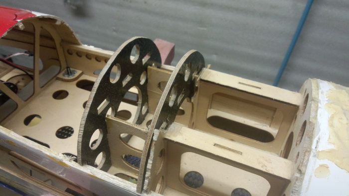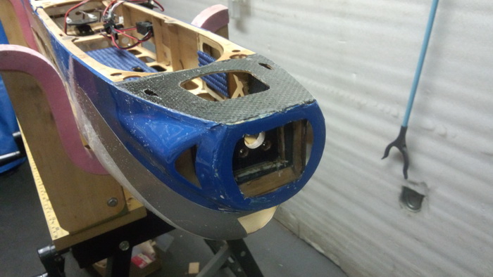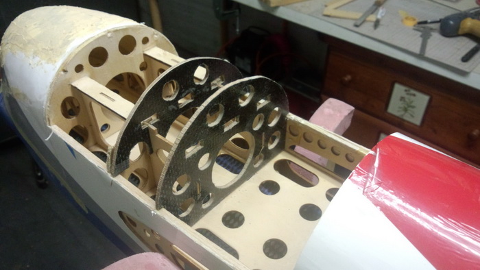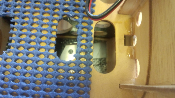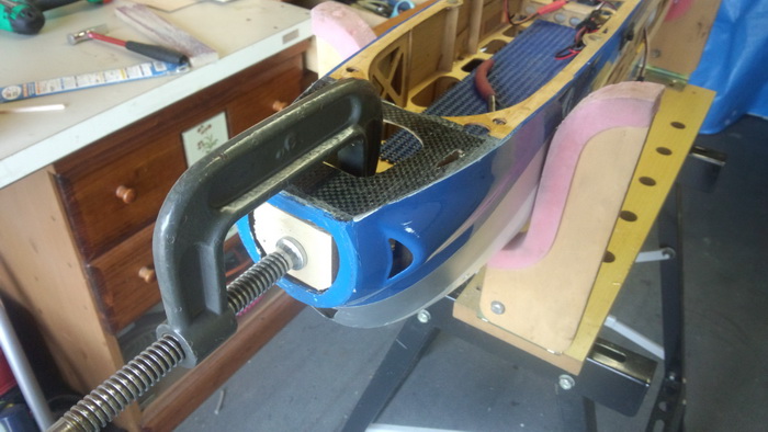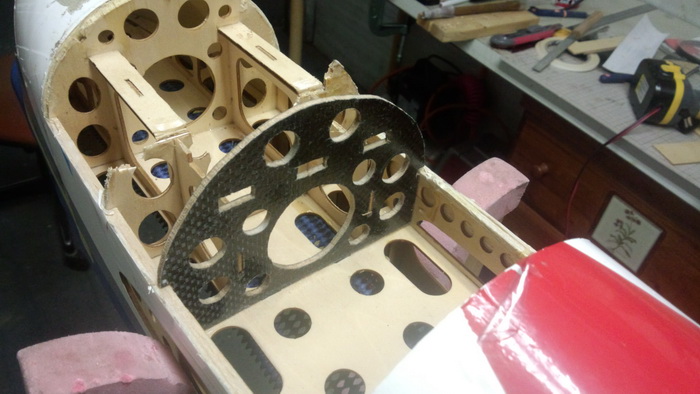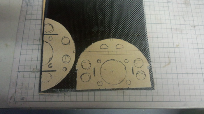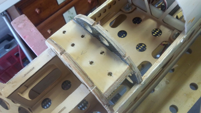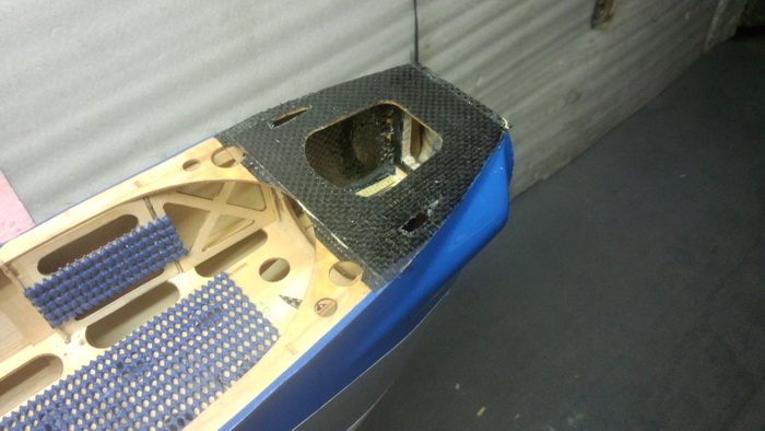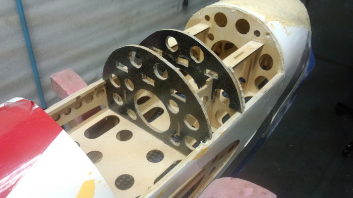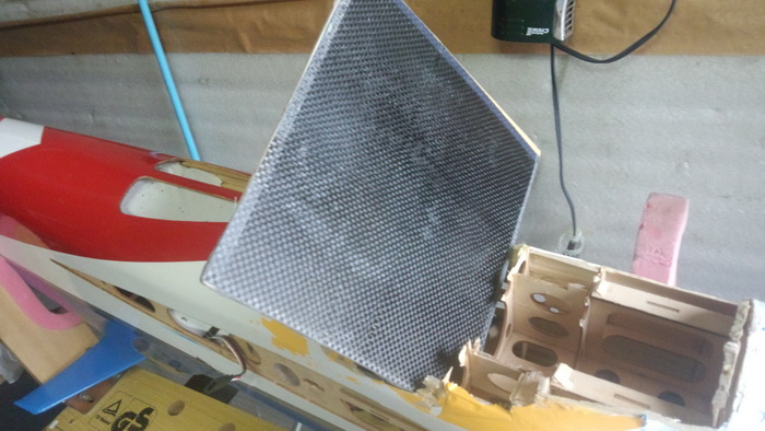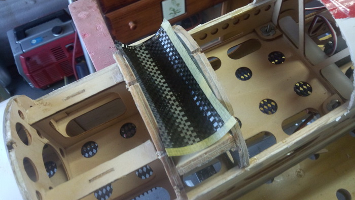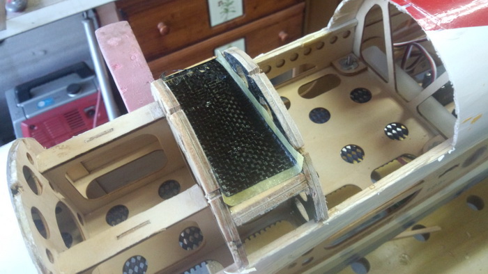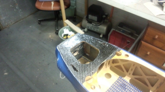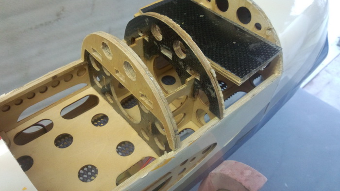 今回は4mmのシナベニヤにカーボンシートを両面貼って部材強度を確保しました。 エポキシを多く使えば綺麗ですが、見えない部分なのでエポキシはかなり少なめでカーボンにやっと浸み込む量にしました。 |