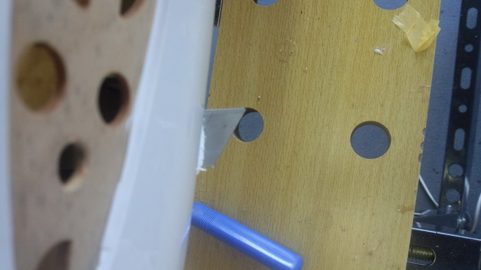 脚の穴を開ける作業で、外からでは穴位置が分かりにくいので、内側にカッターの刃を置いてドライバーで外側におします。 |